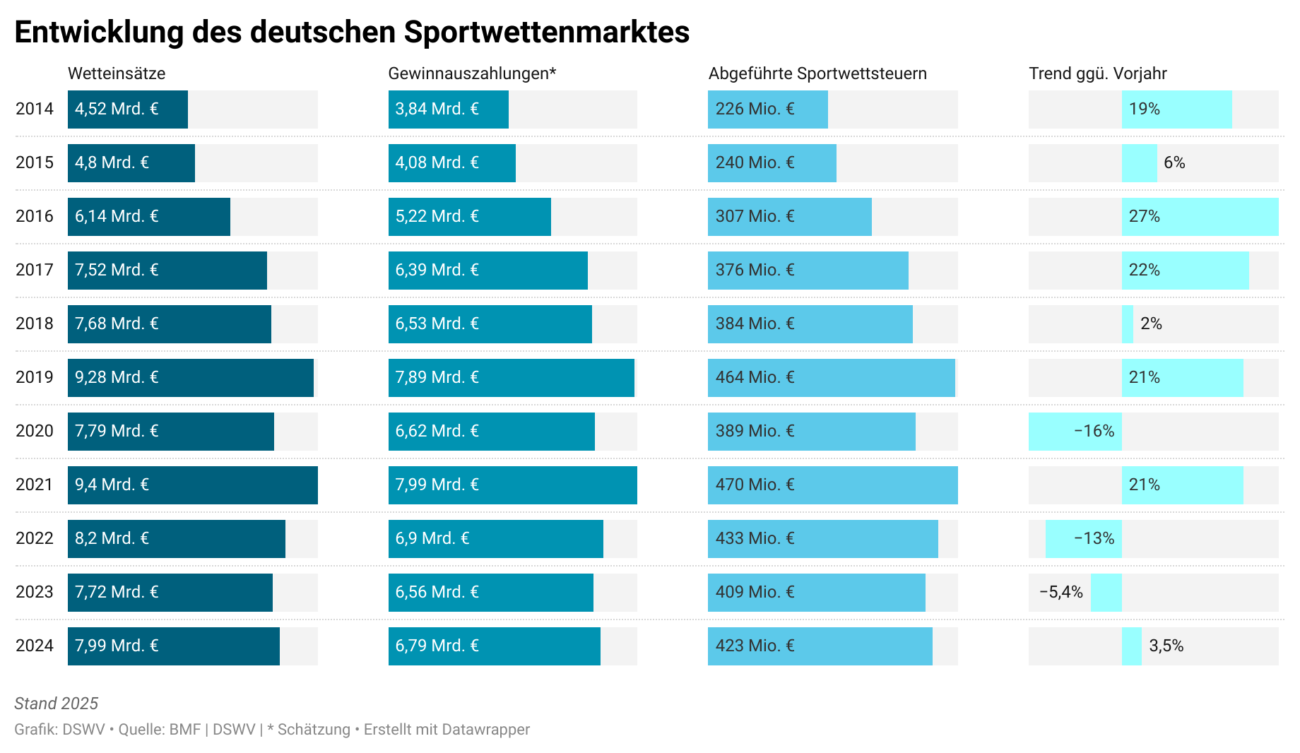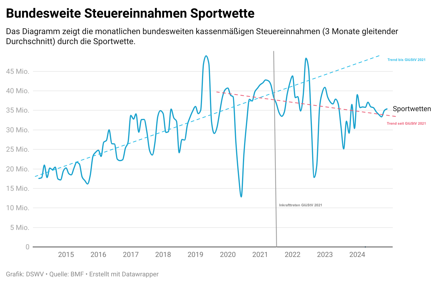 Seit Inkrafttreten des Glückssspielstaatsvertrags 2021 sind die Umsätze der Sportwettenbranche und damit auch die Steuereinnahmen der Bundesländer jedoch rückläufig.